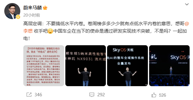 蔚来汽车品牌与传播助理副总裁马麟曾在微博发文呼吁理想汽车董事长兼CEO李想停止发布周榜,认为中国车企当下的使命是通过研发实现技术突破,而非低水平的内卷竞争。