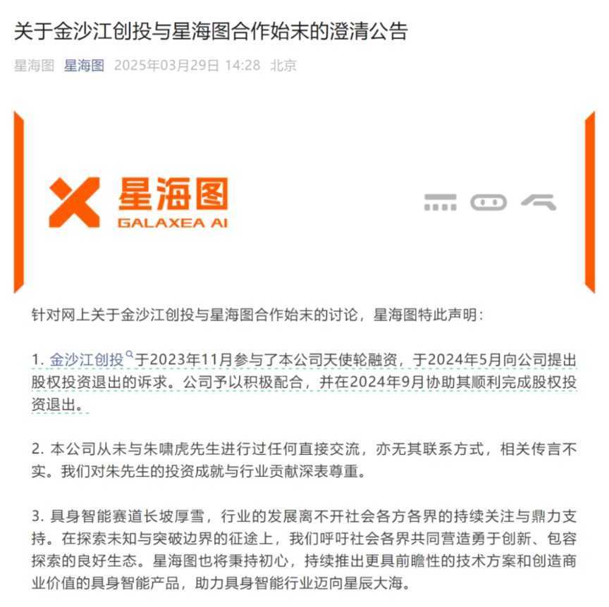 星海图在公告中澄清,金沙江创投于2023年11月参与其天使轮融资,2024年5月提出退出诉求,9月顺利完成退出。星海图持续看好具身智能领域,将推出更具前瞻性的技术方案和商业化产品。松延动力也通过视频回应,展示人形机器人行走能力,表达继续前进的决心。