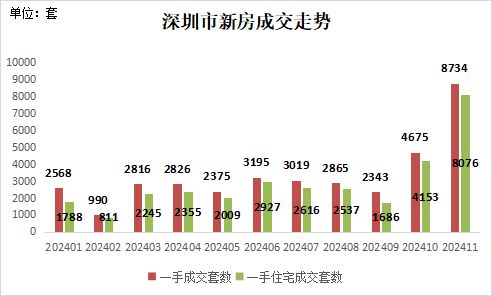 与此同时,新房市场也表现出强劲势头。11月,深圳市预售新房成交量为8734套,环比增长86.8%,同比增长158.9%。其中,住宅成交8076套,环比增长94.5%,同比增长更是高达191.2%。这显示出9·29楼市政策对新房市场的积极影响正在逐步显现。