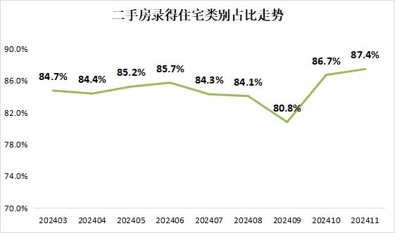 此外,二手房住宅类别的成交占比也有所提升,达到87.4%,较上月提升0.7个百分点。这进一步证明了楼市优化政策对住宅市场需求的积极影响。