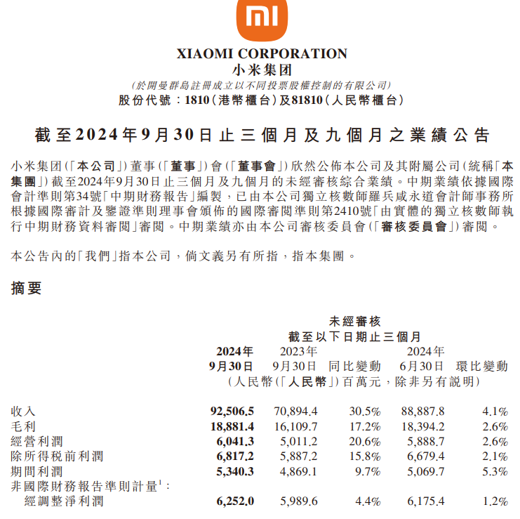 小米集团2024年Q3业绩揭晓:收入大幅增长,智能电动汽车业务持续投入