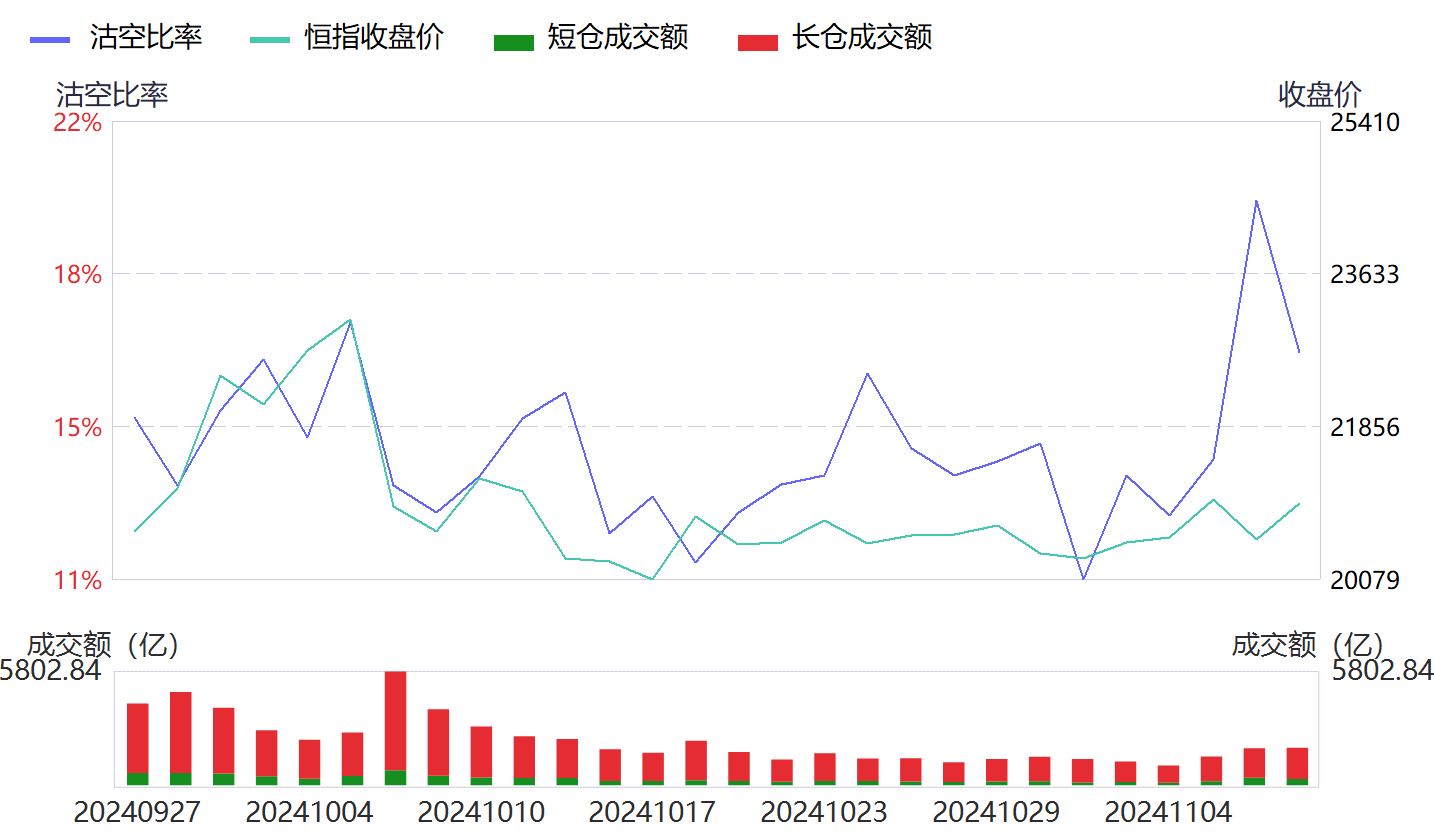 近期,港股市场迎来了持续的反弹行情,然而,与之相伴的是卖空数据的显著增长。据统计,市场的整体沽空比率已从10月底的10.66%攀升至最近的16.46%,期间更是一度突破了20%的关口。