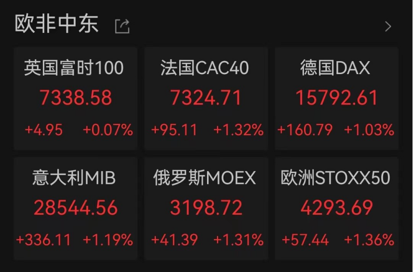 欧洲股市同样表现出色,英国富时100指数、法国CAC40指数和德国DAX指数均实现上涨。