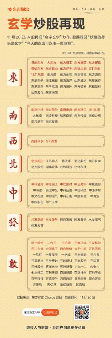 11月20日,A股市场再现了一幕令人啼笑皆非的“玄学炒股”奇观。当天,多只名称中带有“东方”的股票率先涨停,紧接着,名称中包含“东南西北中”方位词或“数字”的股票也相继出现异动,股价普遍上扬,形成了一片红火的景象。这一幕让众多股民忍俊不禁,纷纷调侃道:“今天的盘面简直可以凑一桌麻将了”,“炒股的尽头难道真的是玄学吗?”