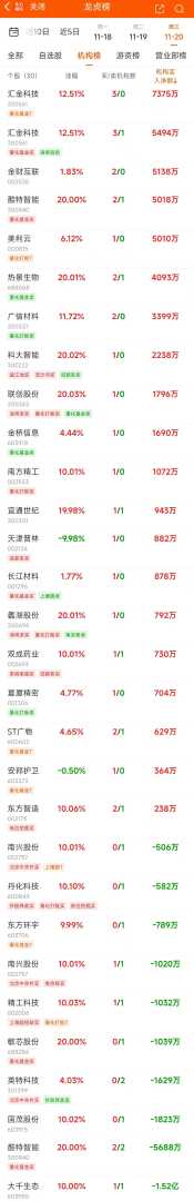 在龙虎榜方面,和而泰成为资金净流入最多的个股,金额高达3.32亿元。该股日内涨停,成交额达到68.41亿元,换手率43.38%。从游资角度看,余哥净买入海能达1.43亿元,而金开大道则净卖出日出东方1.6亿元。从机构角度看,日内机构席位净买入19股,其中净买入汇金科技7375万元,净买入金财互联5138万元。相反,机构席位净卖出大千生态1.52亿元。此外,陆股通净买入美利云6202万元,而净卖出日出东方1.58亿元。