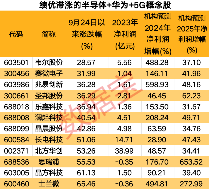 进一步分析发现,这91家公司中,仅有12家公司被机构一致预测2024年、2025年净利润增幅有望超过25%(含2024年有望扭亏),且涉及华为、5G概念。其中,韦尔股份自9月24日以来涨幅仅有28.57%,在12家公司中涨幅最低。但机构预测其2024年净利润增幅有望超过450%。