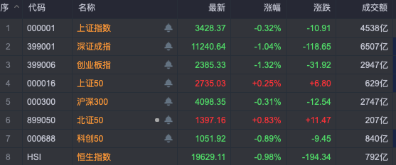 今日早盘,A股市场呈现小幅震荡调整态势,沪深300指数围绕4100点展开激烈争夺,创业板指则在2400点附近徘徊,而上证50与北证50则微幅上涨。市场内超4000只股票下跌,成交量呈现进一步缩减的趋势。