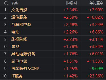 全天来看,文化传媒方向持续领涨,影视院线、短剧游戏、AI等概念涨幅居前。日前,中国银河发布研报,给予传媒互联网行业推荐评级,认为其后续业绩企稳确定性高,市场情绪积极,整体风险偏好较高。建议关注港股互联网、出版行业以及影视院线&游戏行业。