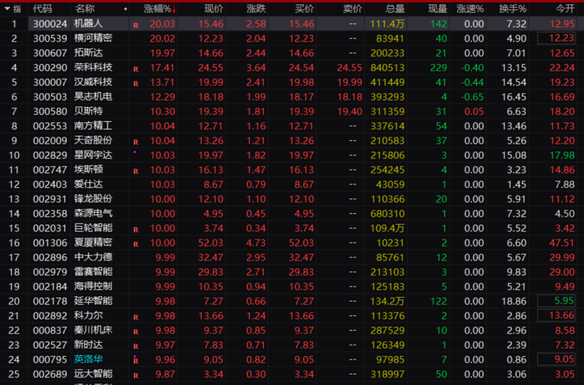 机器人板块大爆发!今日早盘,机器人、瑞迪智驱、拓斯达、天奇股份、爱仕达、鸣志电器、中大力德等20余股强势涨停,昊志机电、丰立智能、江苏北人、江苏雷利等多股涨幅超10%。这一波涨幅不仅点燃了机器人板块的热情,也带动了整个市场题材板块的活跃度。