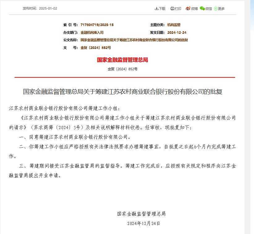 国家金融监督管理总局近日批准筹建江苏农村商业联合银行股份有限公司,筹建期6个月,期间接受江苏金融监管局监督指导,完成后将提交开业申请。