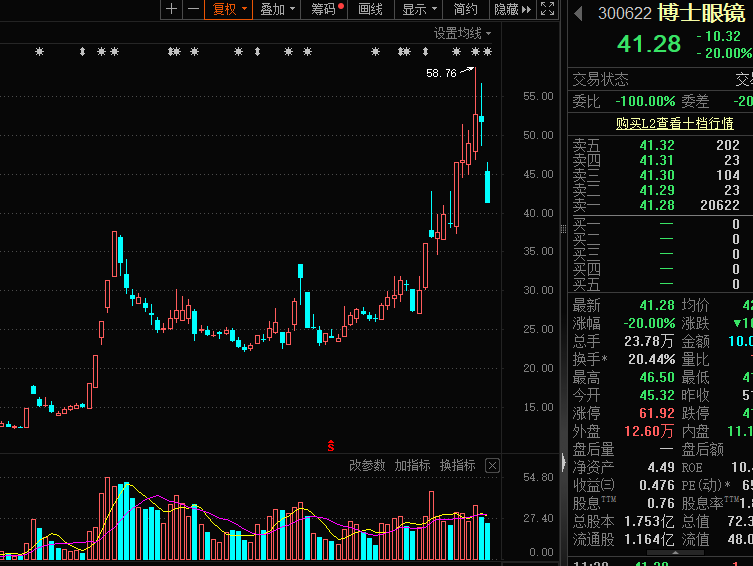 11月19日早盘,A股市场中的AI眼镜概念龙头股——博士眼镜股价出现异常波动,大幅低开后迅速跳水并封死20%的跌停板。与上周五盘中创造的历史新高相比,其最新股价已大幅下滑29.75%。作为AI眼镜概念的佼佼者,该股在年内低点至历史高点的区间内,最大涨幅一度飙升至惊人的4.24倍。