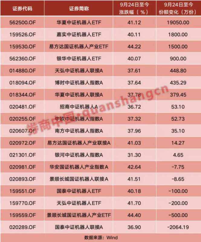 据统计,Wind分类下的“人形机器人”指数在经历10月初的短暂回调后,继续延续上涨趋势,自9月23日以来累计涨幅超过56%。此外,多只“机器人ETF”同期涨幅也超过40%。在份额方面,华夏中证机器人ETF在一个多月内份额增长超过1亿份,嘉实基金、易方达基金旗下相关产品份额也均有显著增加。
