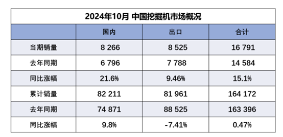 根据中国工程机械工业协会的统计数据,2024年10月,挖掘机总销量为16791台,同比增长15.1%。其中,国内销量为8266台,同比增长21.6%;出口量为8525台,同比增长9.46%。