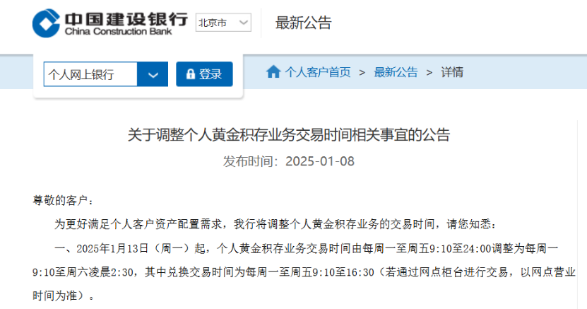 1月8日,建设银行发布了一则公告,宣布自2025年1月13日起,个人黄金积存业务的交易时间将得到延长,由原先的每周一至周五9:10至24:00,调整为每周一9:10至周六凌晨2:30。