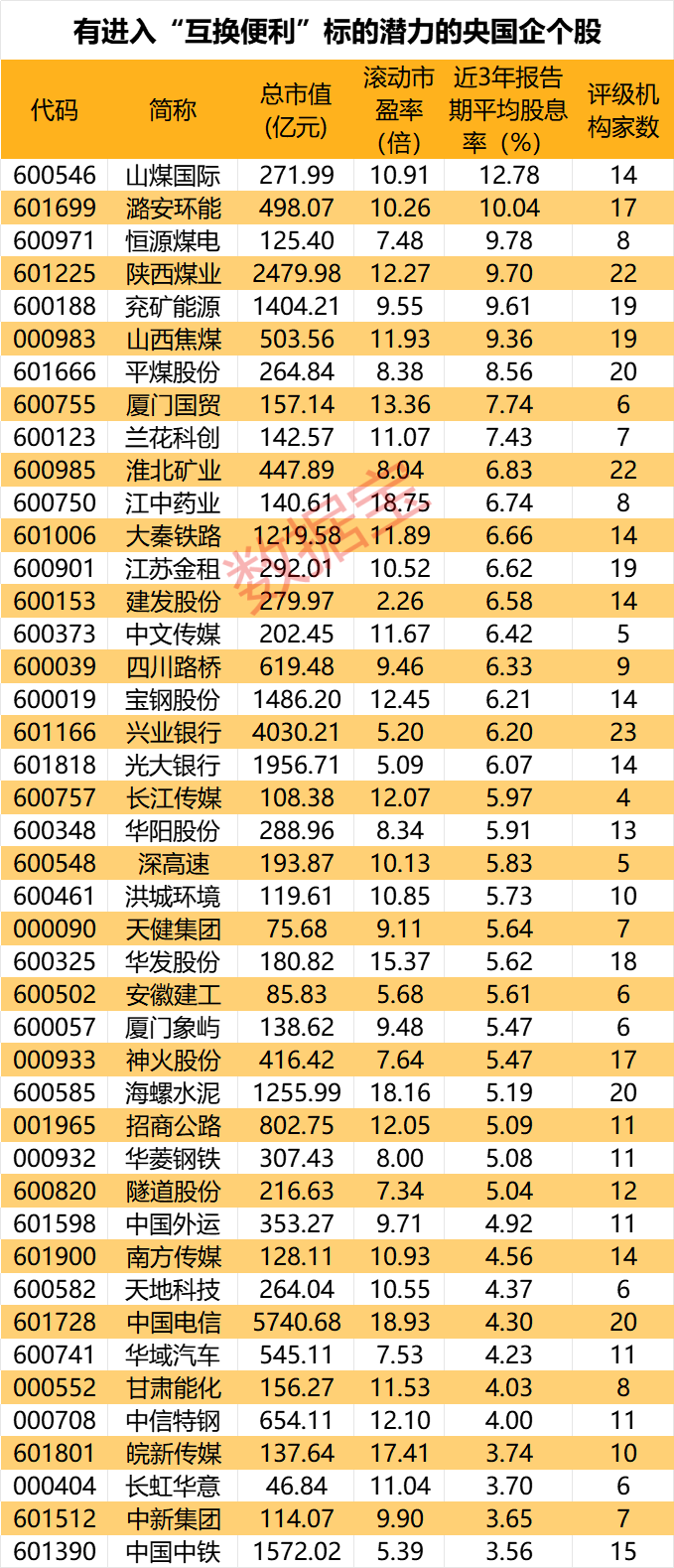 数据宝以最新收盘价为基础,筛选出了一批优质低估值高股息央国企股。这些个股需满足以下条件:2021年至2023年报告期股息率均高于3%;年内涨幅低于30%;最新滚动市盈率低于20倍;评级机构在5家以上。据统计,共有43只个股入选。从市值角度看,中国电信市值最高,超过5700亿元;兴业银行次之,为4030.21亿元。此外,招商公路、中信特钢、四川路桥等个股市值也均超过500亿元。而市值最低的个股是长虹华意,仅为46.84亿元。