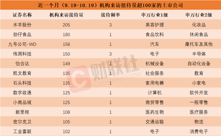 据Choice数据显示,近一个月(9.19-10.19)期间,包括水羊股份、劲仔食品、九号公司-WD、伟测科技、怡合达、凯文教育、石头科技、数字政通、小商品城、新里程、密尔克卫和工业富联在内的12家上市公司机构来访接待量超过100家,具体数据见下图: