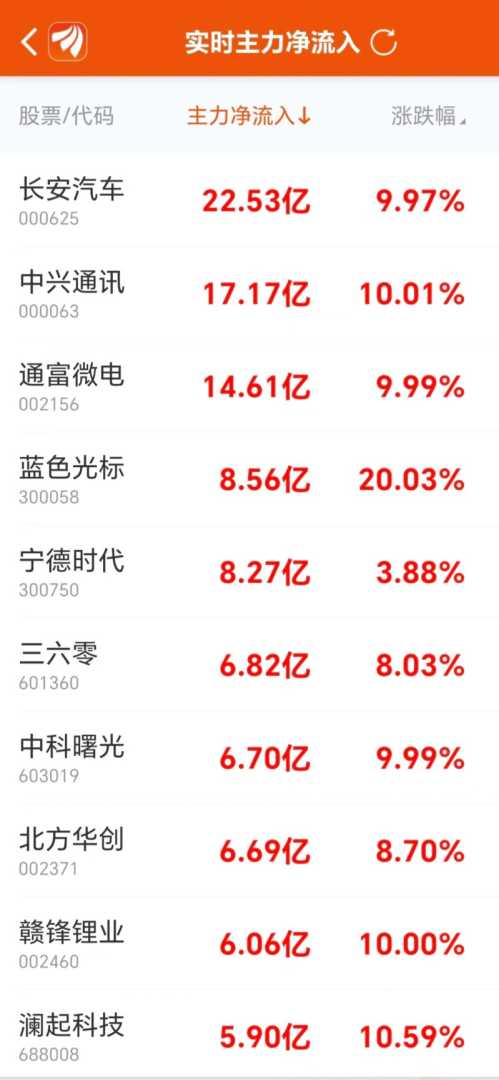 具体到个股方面,东方财富Choice数据显示,11月11日主力净买入前十大个股中,长安汽车以22.53亿元的净买入额位居榜首,且该股当日涨停;中兴通讯则以17.17亿元的净买入额紧随其后,同样涨停。