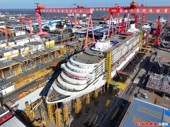 第二艘国产大型邮轮“爱达·花城号”在中国船舶集团有限公司旗下上海外高桥造船有限公司实现全船贯通,建造速度比肩欧洲顶尖企业,数字化造船技术助力效率提升。