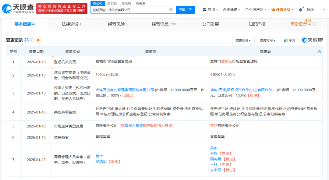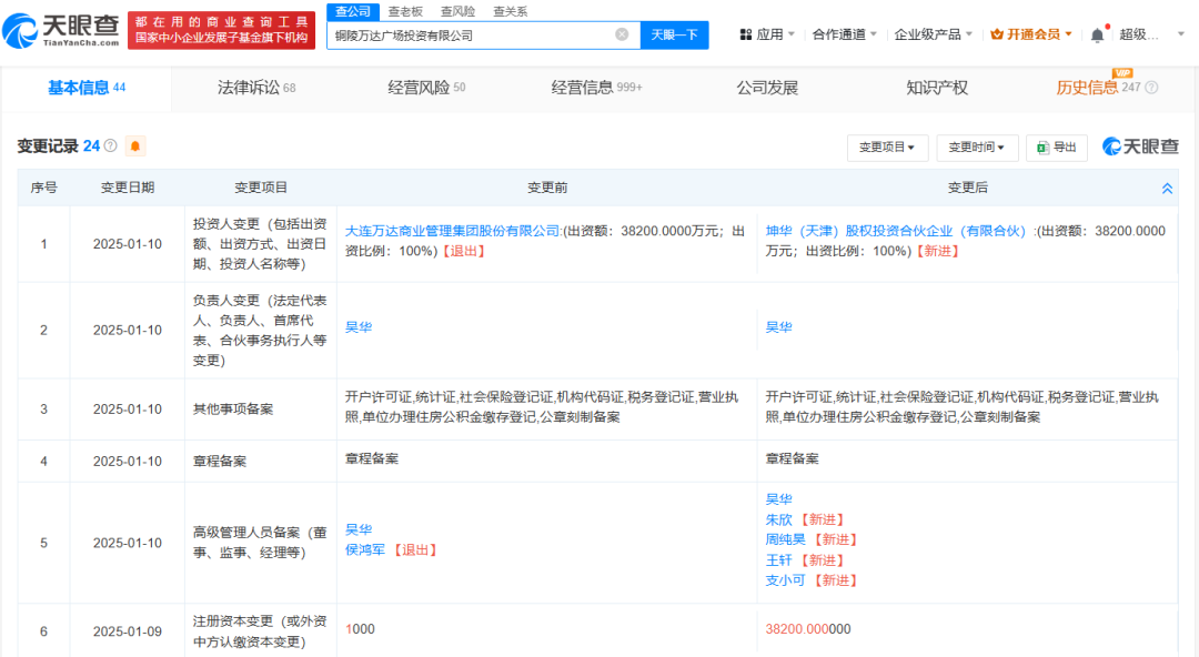天眼查数据显示,1月10日,铜陵万达广场投资有限公司和宣城万达广场投资有限公司均发生了工商变更。原全资股东万达商管退出,新增全资股东均为坤华投资。同时,这两家公司的注册资本也大幅上升,铜陵万达广场投资有限公司的注册资本由1000万元变更为3.82亿元,宣城万达广场投资有限公司的注册资本由1000万元变更为4.1亿元。