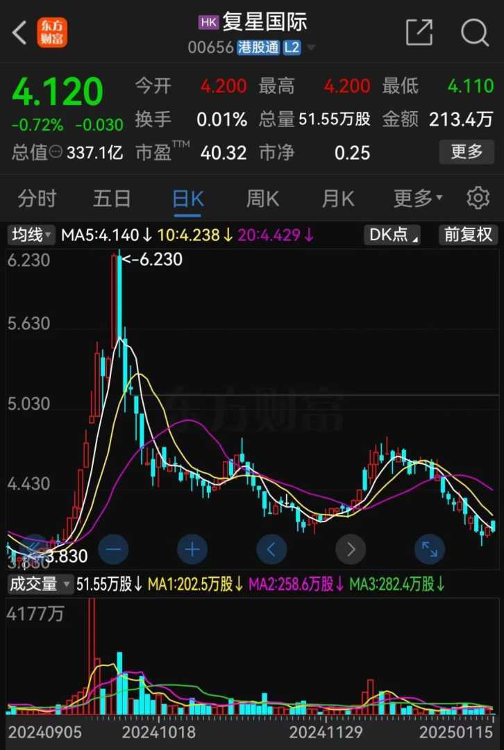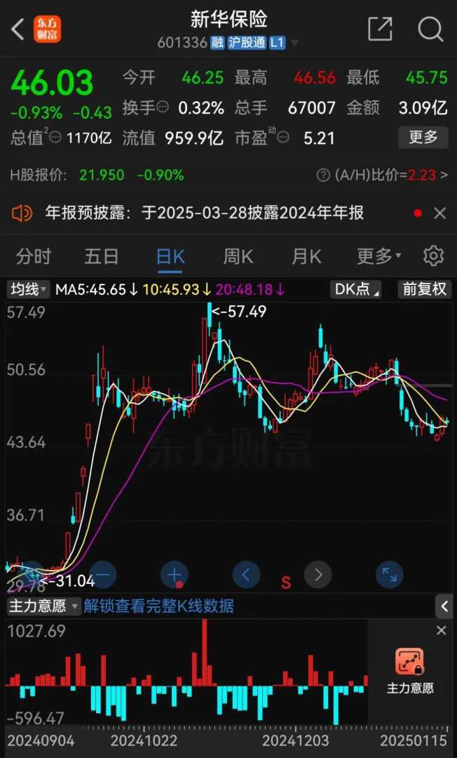 截至1月15日午盘,新华保险A股股价报46.03元/股,总市值为1170亿元;复星国际的港股股价报4.12港元/股,总市值为337.1亿港元。