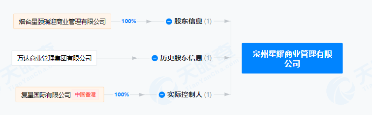 另一方面,天眼查数据显示,1月9日,泉州市丰泽区安吉万达商业管理有限公司也发生了工商变更。企业名称变更为泉州星耀商业管理有限公司(泉州星耀),全资股东万达商管退出,新增全资股东为烟台星颐瑞迎商业管理有限公司,实控人变更为复星国际。