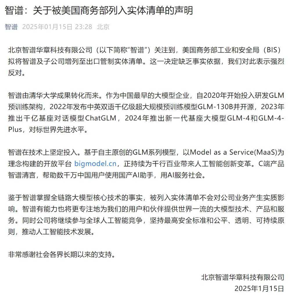 据智谱官微于1月15日晚间发布的消息,北京智谱华章科技有限公司(下文简称“智谱”)已注意到,美国商务部工业和安全局(BIS)计划将智谱及其子公司列入出口管制实体清单。智谱对此表示,该决定缺乏充分的事实依据,公司坚决反对这一不公正的决定。