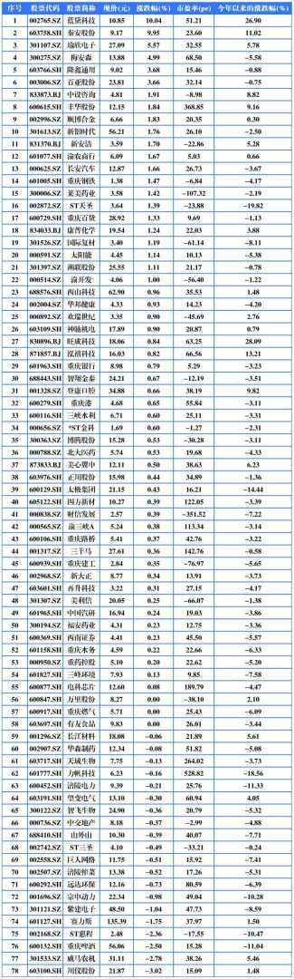 此外,当日还有3家企业平收,包括万里股份、重庆燃气、有友食品。而下跌企业共有20家,其中川仪股份、威马农机、重庆啤酒分别以-3.02%、-2.78%、-2.50%的跌幅位列最后三位。