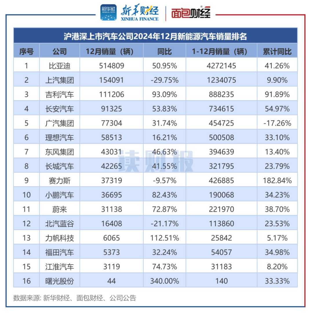 在新能源汽车领域,约有16家公司披露了相关数据。2024年12月,这些公司合计销售新能源汽车约122.87万辆,同比增长26.31%,当月新能源汽车渗透率达到约52.13%。尽管连续两个月出现下降,但全年累计销量仍达到986.47万辆,同比增长32.62%。比亚迪和上汽集团全年销量位居前二,而赛力斯、吉利汽车、长安汽车的销量增速也名列前茅。