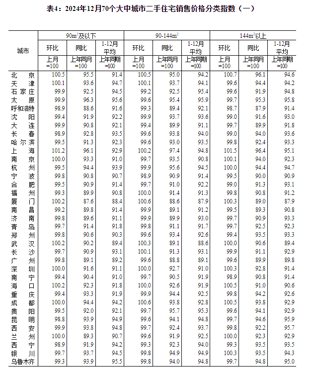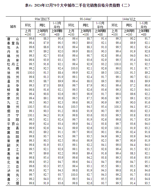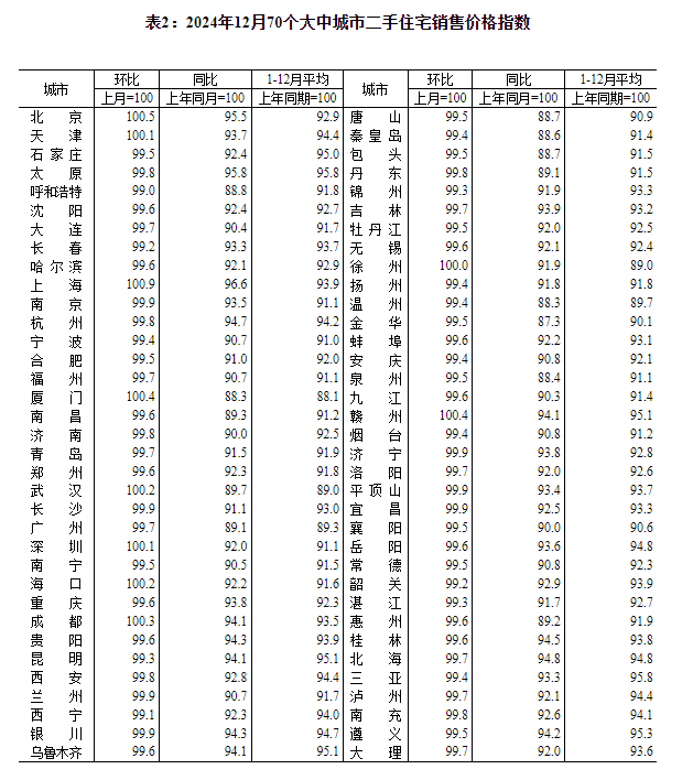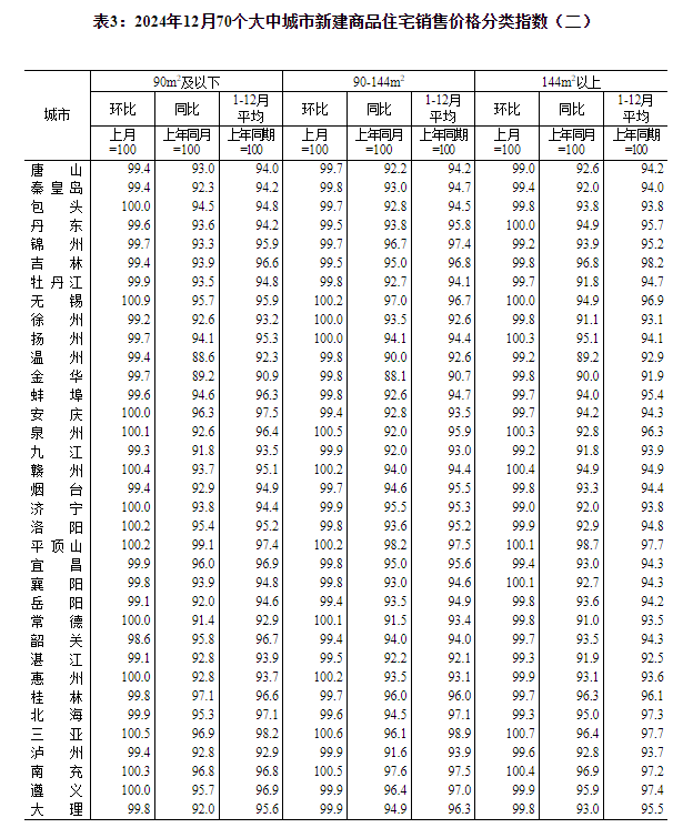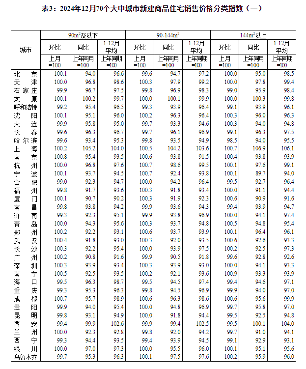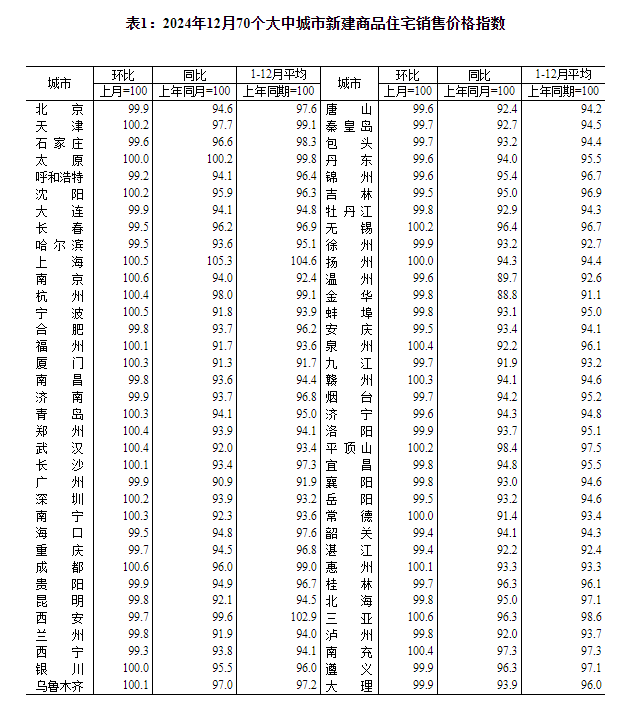 以下是国家统计局发布的2024年12月份70个大中城市商品住宅销售价格变动情况详细数据: