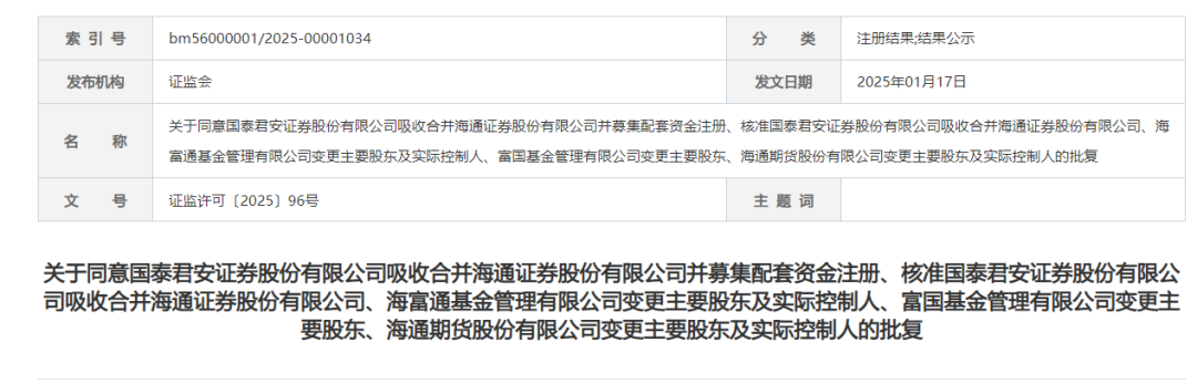 【导读】证监会正式批复:国泰君安将吸收合并海通证券,并募集配套资金100亿元。