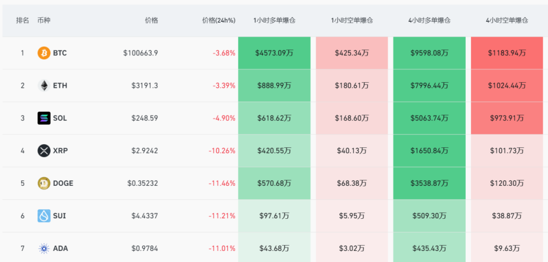 虚拟币市场突现剧烈波动!在全球股市整体向好的背景下,尤其是特朗普发行的虚拟币一度提振市场情绪之时,虚拟币市场却意外遭遇大幅下跌。早盘交易中,比特币价格一度跌破10万美元大关,日内最大跌幅达到4.4%;以太坊价格也跌破3200美元,而狗狗币和瑞波币的跌幅更是超过了10%。据统计,过去24小时内,全球范围内共有39.87万名投资者因爆仓而遭受损失,爆仓总金额高达11.63亿美元。