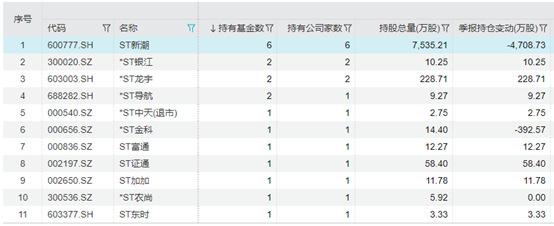 截至一季度末,共有11只ST股被公募基金持仓。从产品类型来看,持ST股的基金多为指数型基金、公募量化基金以及少量主动权益型基金。其中,ST新潮是被公募基金持有最多的个股,共有6只基金持有,涉及6家基金公司,总体持仓为7535.21万股。然而,与上季度末相比,持仓量减少了4708.73万股。兴全绿色投资是持股最多的基金,持股量高达7125.86万股,该基金由邹欣管理,最新规模为37.94亿元。其他基金如长城久泰沪深300A、鹏华国证石油天然气ETF、国泰中证油气产业ETF等也分别持有一定数量的ST新潮股份。