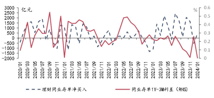 兴业研究研究员顾怀宇也表示,从历史数据来看,理财、基金和货币基金三类资管机构是同业存单的传统配置户。其中,理财产品在二级市场是同业存单的净买入方,对同业存单期限利差的影响较大。随着2月理财产品增持债券规模或季节性上升,1Y-3M同业存单利差趋于走阔,短久期同业存单或存在一定的相对价值。