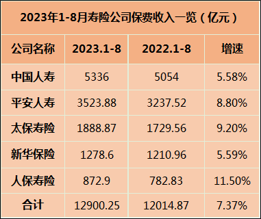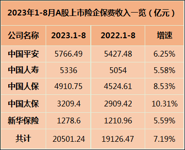 具体来看,中国平安保费收入为5766.49亿元,同比增长6.25%;中国人保保费收入为4910.75亿元,同比增长8.53%;中国太保保费收入为3209.4亿元,同比增长10.31%。而以寿险为主体的新华保险和中国人寿也分别实现了保费收入的正增长,前8个月保费收入分别为1278.6亿元和5336亿元,同比分别增长5.59%和5.58%。