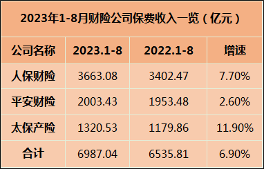 在财产险方面,人保财险、平安财险、太保产险三家财险公司前8个月合计实现保费收入6987.04亿元,同比增长6.9%。其中,人保财险实现保费收入3663.08亿元,同比增长7.7%;太保产险实现保费收入1320.53亿元,同比增长11.9%;而平安财险实现保费收入2003.43亿元,同比增长2.6%,增速相对较慢。具体到占比最大的车险板块,受8月新车销量小幅回暖影响,车险保费略有提升。