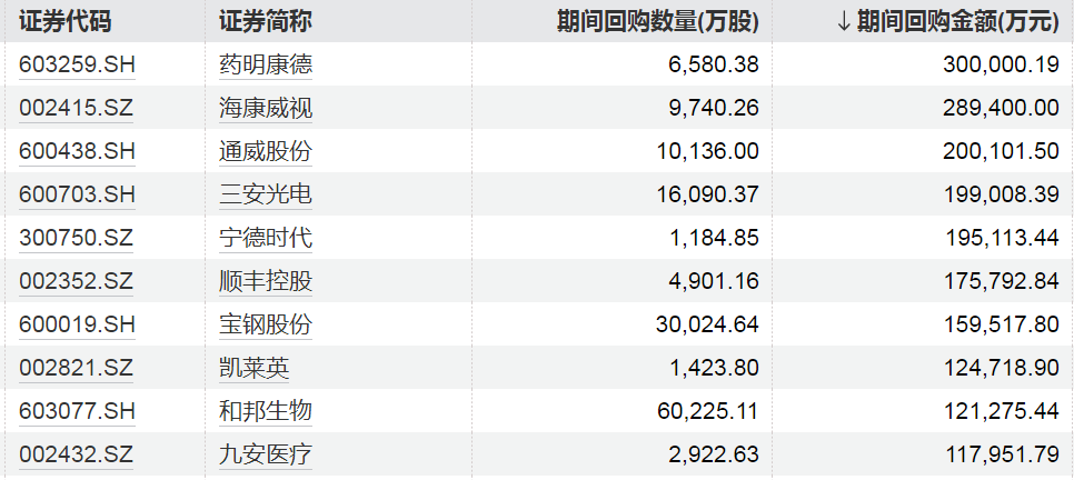 此外,今年以来已有11家上市公司的回购金额超过10亿元,包括药明康德、海康威视、通威股份等行业巨头。这些大额回购不仅彰显了上市公司的财务实力,也向市场传递了积极的信号。