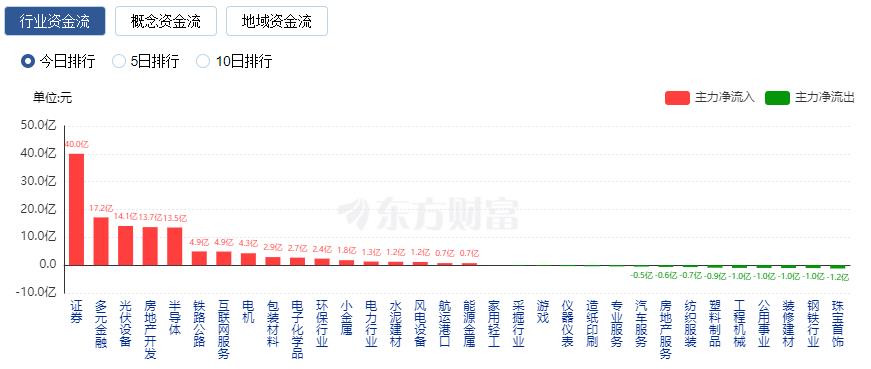 行业资金流向方面,证券、多元金融、光伏设备等净流入排名靠前,其中证券板块净流入40.02亿元。净流出方面,软件开发、光学光电子、消费电子等净流出排名靠前,软件开发板块净流出75.75亿元。