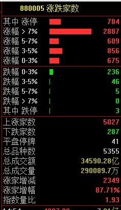 个股方面,市场延续普涨态势,共有5027只个股上涨,784只股票涨停,仅287只个股下跌,3只个股跌停。鸿蒙概念股震荡走高,法本信息、天源迪科、诚迈科技、软通动力等百股涨停。算力概念股同样震荡走强,新易盛、寒武纪、安诺其、工业富联等多股涨停。