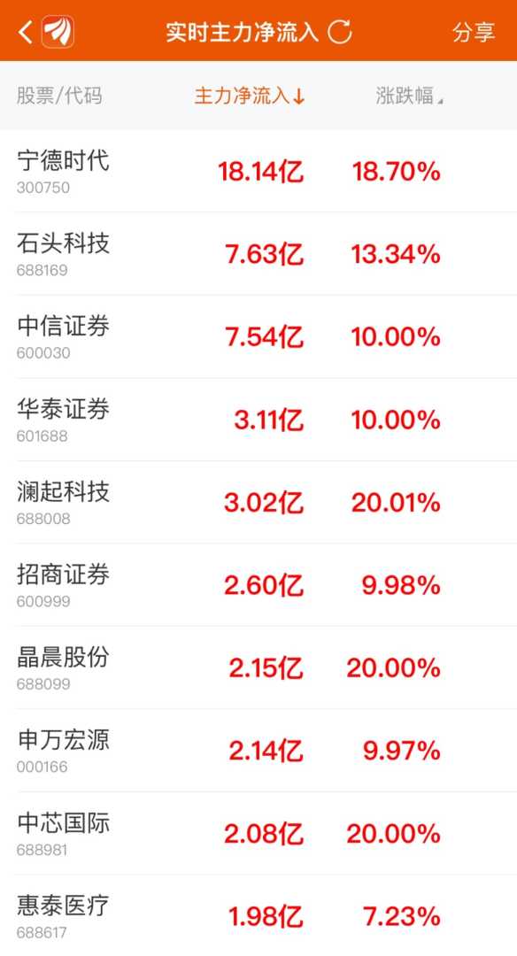 东方财富Choice数据显示,10月8日主力净买入前10大个股中,宁德时代以18.14亿元的净买入额位居榜首,该股当日大涨18.7%;石头科技紧随其后,净买入额达到7.63亿元,涨幅超过13%。