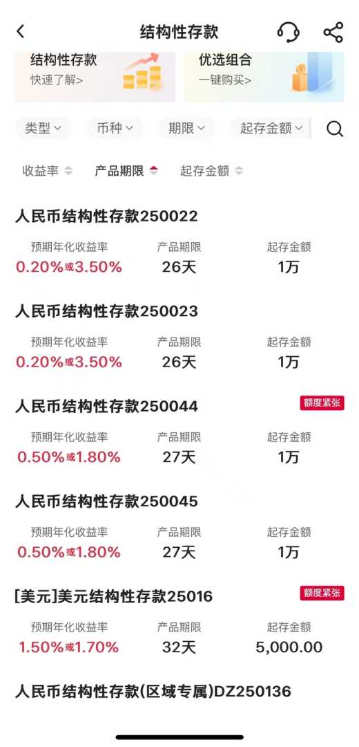 此外,中国银行还发售了多款结构性存款产品,其中两款已显示额度紧张,起存金额分别为1万元和5000元。同时,市场上还出现了多款挂钩黄金的结构性存款产品,如兴业银行推出的多款黄金看涨产品。随着黄金价格持续上涨,多家机构积极布局黄金资产,加速发行挂钩黄金的理财产品。