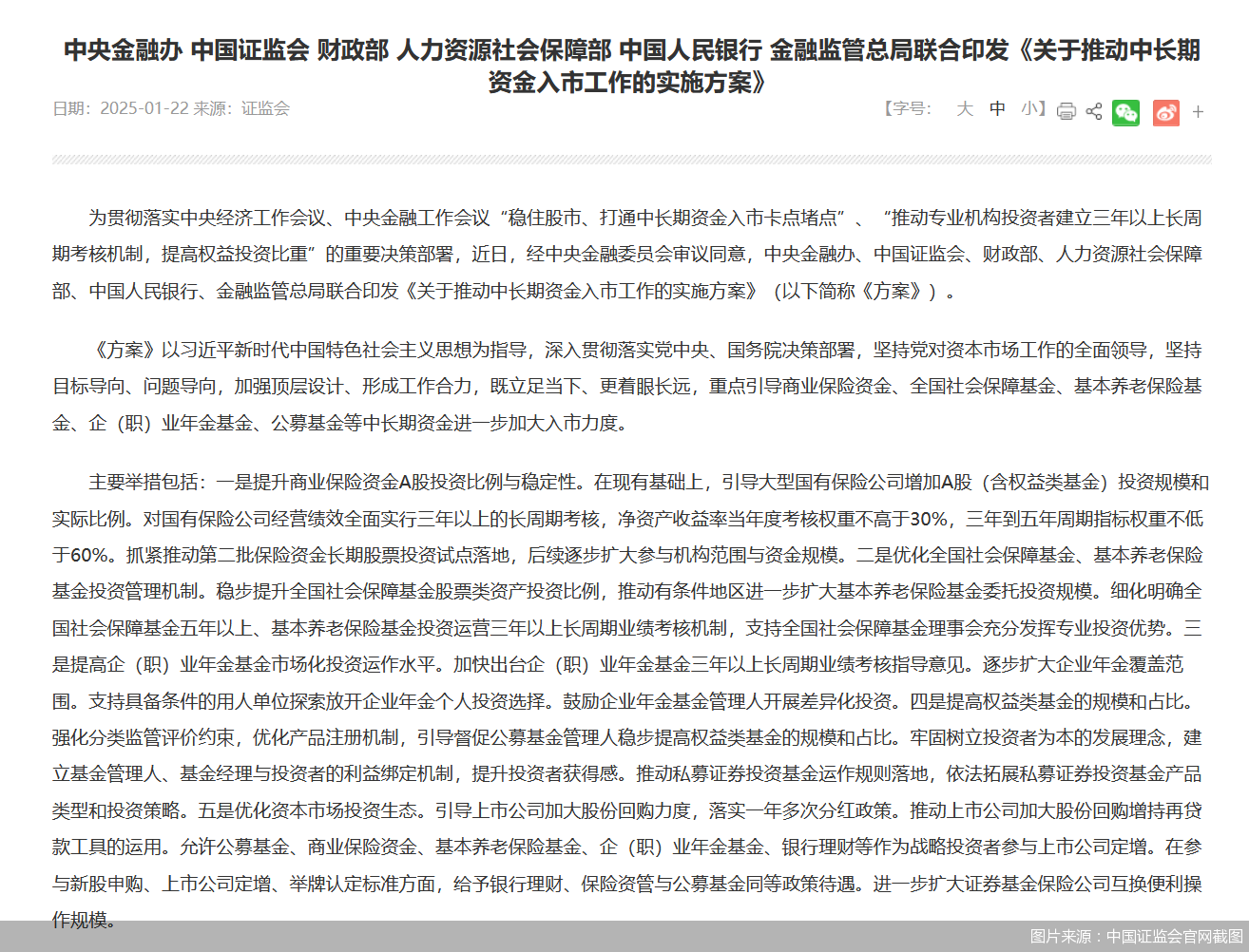银行理财在资本市场的参与度再次迈出了重要一步。2025年1月22日,由中央金融办、中国证监会、财政部等多部门联合印发的《关于推动中长期资金入市工作的实施方案》正式出炉,该《方案》明确指出,银行理财等金融机构将被允许作为战略投资者参与上市公司的定向增发(定增),并且在参与新股申购、上市公司定增以及举牌认定标准方面,银行理财、保险资管将享受与公募基金同等的政策待遇。