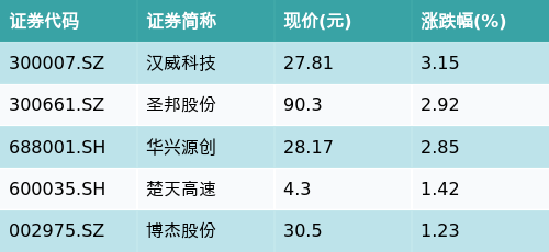 在个股层面,截至收盘,无线耳机主题中表现各异的五只股票脱颖而出,分别为:汉威科技(代码:300007.SZ)、圣邦股份(代码:300661.SZ)、华兴源创(代码:688001.SH)、楚天高速(虽属交通运输板块,但当日受无线耳机主题影响有所波动,代码:600035.SH)以及博杰股份(代码:002975.SZ)。这些股票的涨跌幅情况反映了市场对于无线耳机及相关产业链的不同预期,详细数据请参见下表: