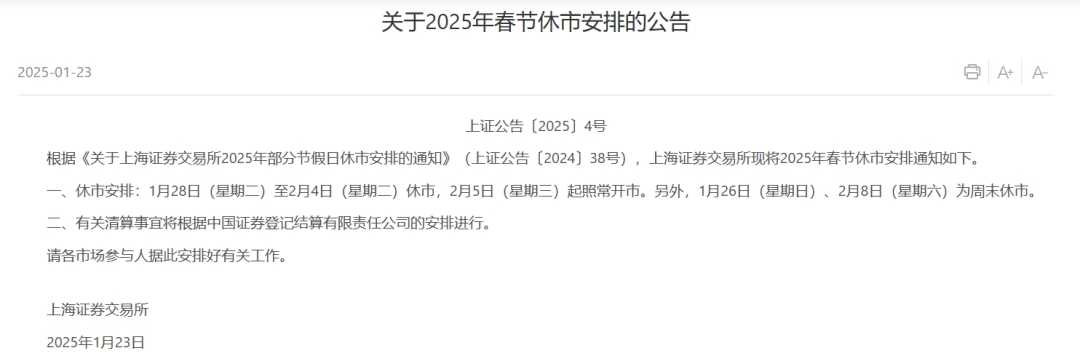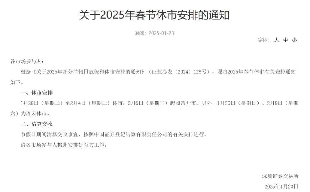 沪深交易所发布2025年春节休市安排