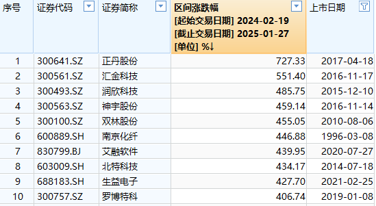 在龙年A股市场中,表现最为抢眼的当属十大牛股。剔除2024年新上市的次新股后,正丹股份凭借高达727.33%的累计涨幅夺得榜首,汇金科技与润欣科技分别以551.40%和485.75%的涨幅紧随其后。第4至第10名的牛股依次为神宇股份、双林股份、南京化纤、艾融软件、北特科技、生益电子和罗博特科,这些股票的龙年涨幅均超过400%,展现出强劲的市场表现。