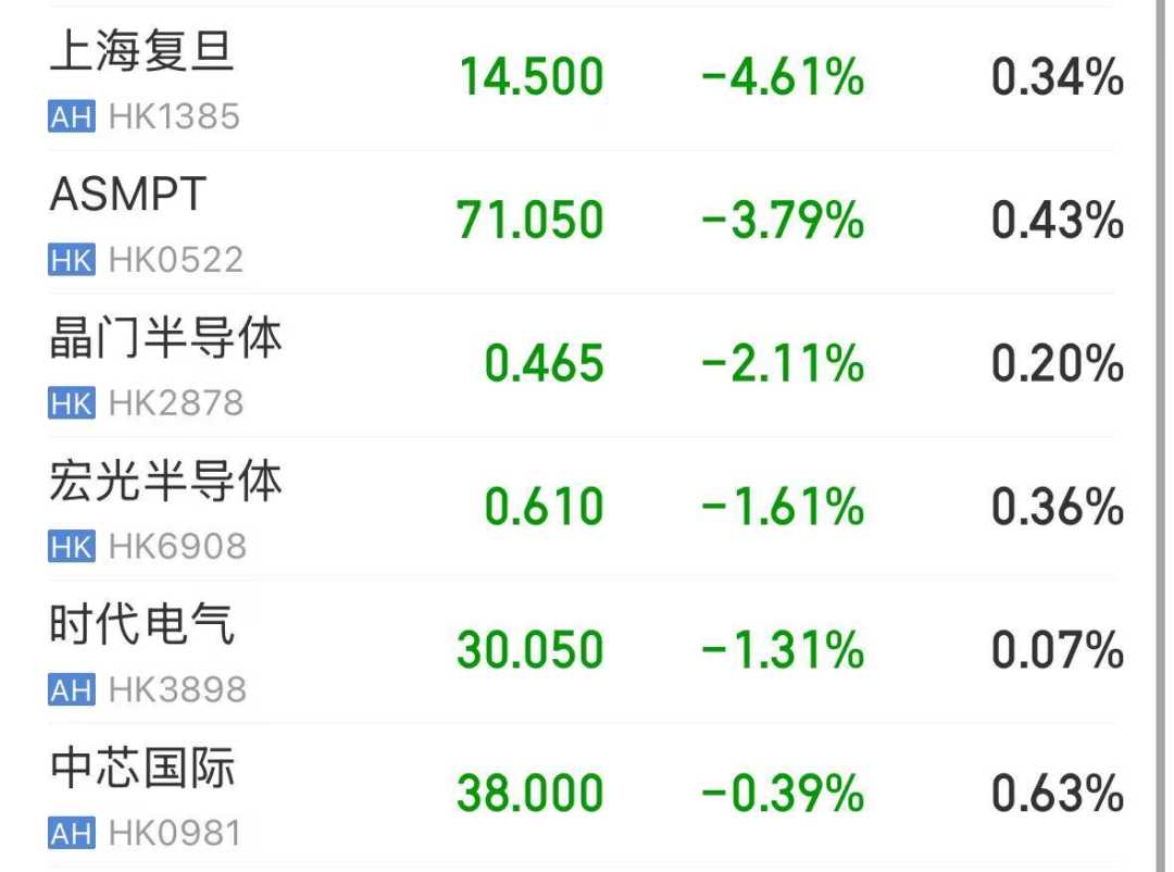 然而,半导体股多数下跌,上海复旦跌幅达到4.61%,中芯国际亦下跌0.39%。