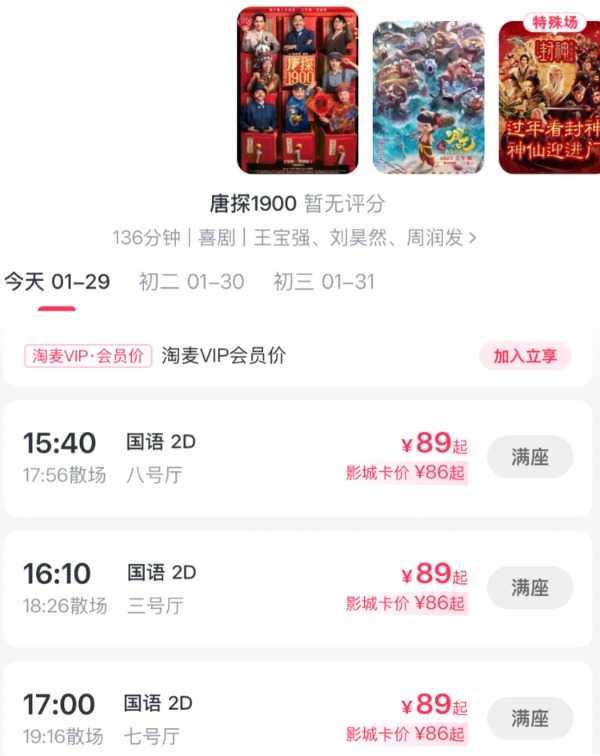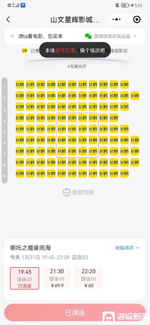 记者在猫眼平台搜索发现,1月31日济南、潍坊多家影院的多部影片热门场次票价在29.9元至69.9元不等,且下午场多个场次已售罄,购票APP显示满座,晚上的热门场次也几乎售完。