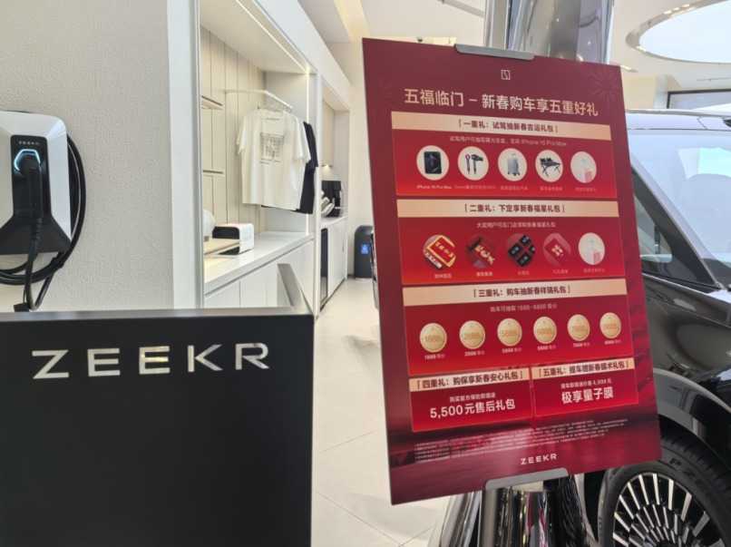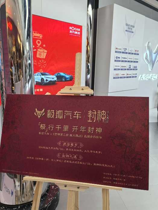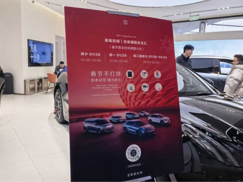 极氪门店同样在春节期间“不打烊”,除除夕和大年初一营业时间略有缩短外,初二至初七均正常营业。此外,多家门店内进行了新年装饰,现场气氛喜庆热烈,部分品牌还顺势推出了新春购车活动,进一步激发了消费者的购车热情。还有品牌采取与春节档电影联动的方式进行推广,成功吸引了更多消费者的关注。