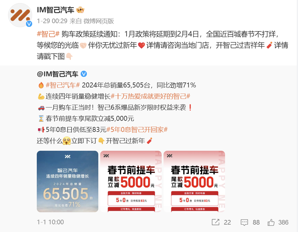 此前,多家车企及相关品牌已宣布2025年春节期间“服务不打烊”。例如,智己汽车宣布全国范围内的152家门店将全天候开放,为广大消费者提供赏车与试驾体验服务,同时2025年1月购车政策也延期到了2月4日。小米汽车也表示,在1月22日至2月9日期间,提供24小时免费道路救援服务,线上线下服务均不打烊。阿维塔官方同样启动了“春节不打烊”用户服务,包括免费专业的车辆检测服务、43处高速服务区驻点、海南岛离岛服务、特定地区雪地胎和防滑链服务以及全天候道路救援等。