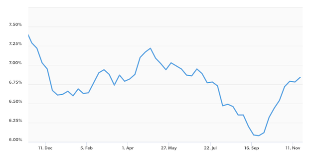 回顾过去的三年,美国的平均抵押贷款利率已经翻了一番还多。2021年8月19日,30年期固定利率的平均水平仅为2.86%,而截至11月21日,这一数字已经攀升至6.84%。尽管美联储在9月进行了降息操作,但美国的房贷利率并未随之下降,反而继续攀升。