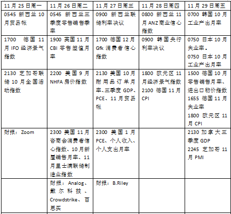 本周市场看点丰富,美联储会议纪要及美国个人消费支出通胀数据(PCE)将备受瞩目,投资者将继续评估特朗普当选后美联储降息步伐是否会受到影响。同时,欧元区通胀数据也将对欧央行是否继续降息50个基点产生重要影响。地缘政治局势的不稳定可能对大宗商品市场造成冲击,特别是黄金和原油的走势。